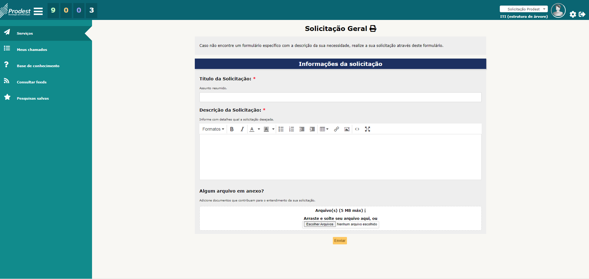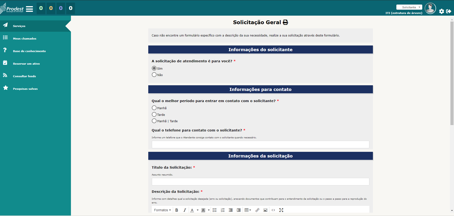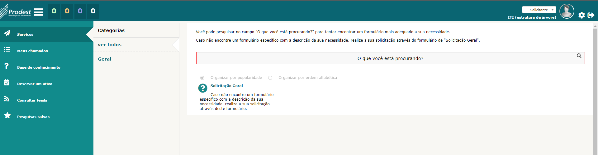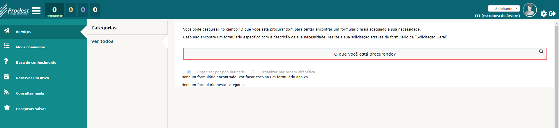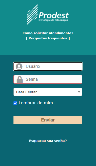 Passo 1: Acesse https://servicedesk.prodest.es.gov.br Nos campos Usuário e Senha, informe o nome de usuário (liberado para solicitar atendimento) e a sua senha. Depois, clique no botão "Enviar". Caso não possua usuário e senha cadastrado, clique em "Como acessar?" nas [ Perguntas frequentes ] para mais informações. Passo 2:Pesquise no campo "O que você está procurando?" ou navegue pelas categorias (do lado esquerdo) e formulários, até encontrar um formulário que descreva o seu tipo de necessidade. Clique no formulário desejado e preencha as informações solicitadas com o maior detalhamento possível. Caso não encontre um formulário com a descrição do que você precisa, clique no formulário de "Solicitação Geral" na categoria "Geral" e detalhe ao máximo a sua solicitação.