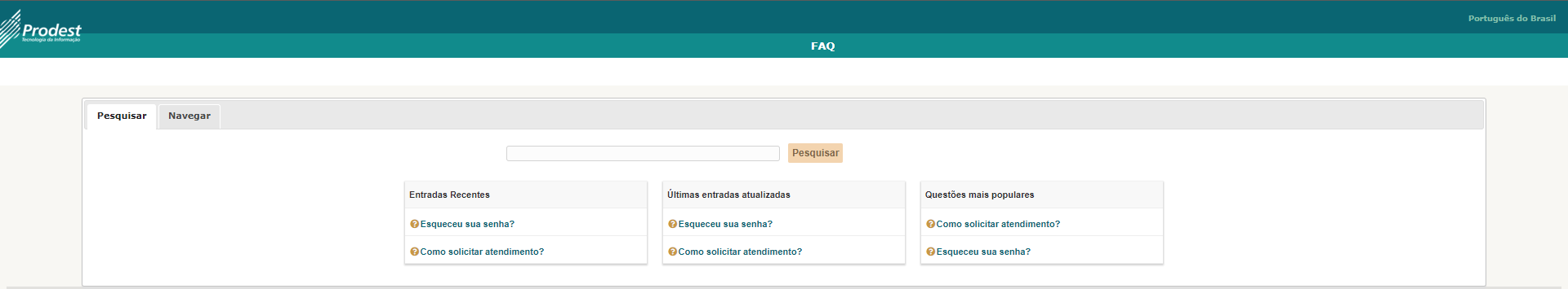 ConteúdoInstrução de UsoAntes de solicitar atendimento, pesquise na FAQ (perguntas frequentes) se já não existe um procedimento simplificado para atender a sua necessidade clicando no link Ou clicando no item "Base de conhecimento" após ter feito o logon com sucesso.