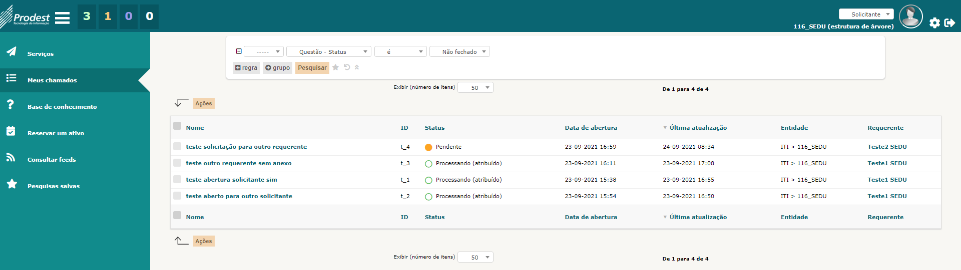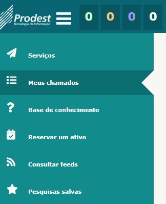Passo 3:Para acompanhar as suas solicitações de atendimento realizadas, clique no item "Meus chamados" no menu esquerdo. Serão exibidas todas as suas SAs (solicitações de atendimento) com o respectivo "ID" e "Status" de atendimento.