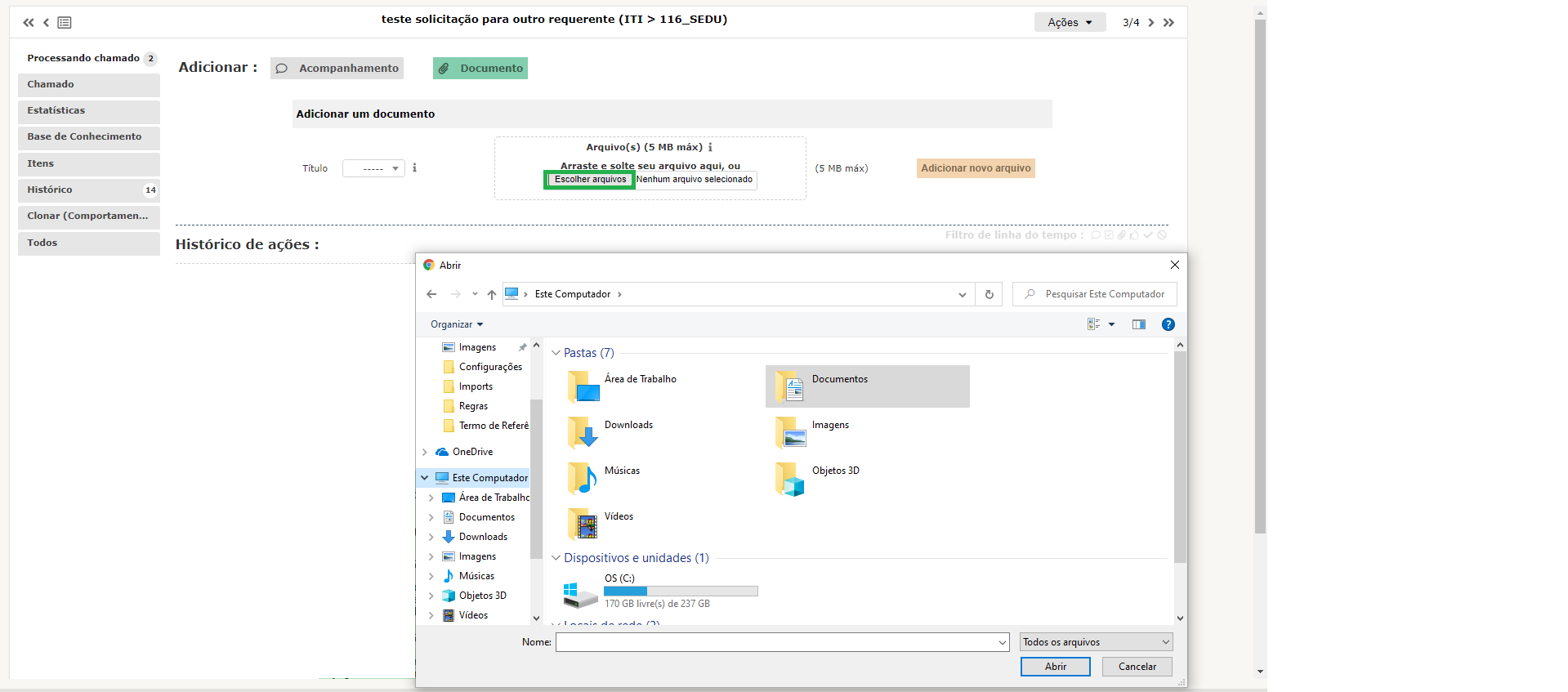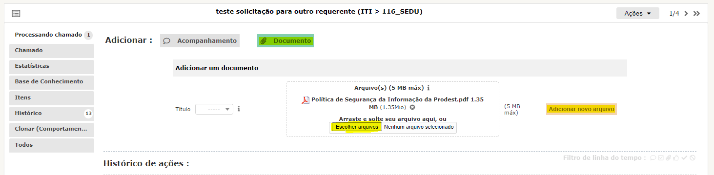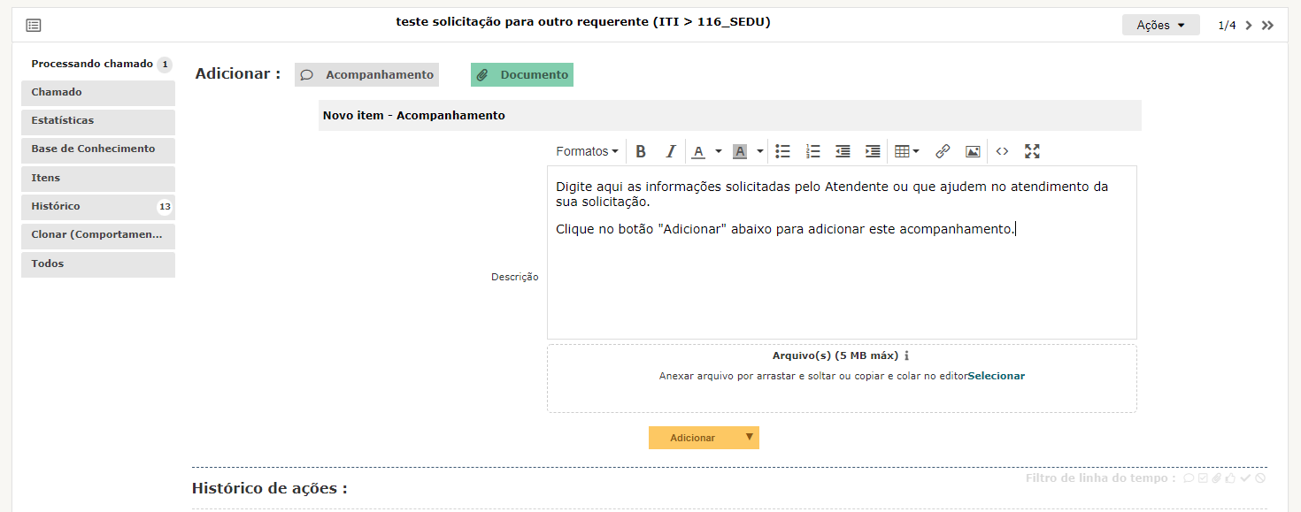 Passo 5:Ao clicar em "Processando chamado" é possível acompanhar as tarefas realizadas na SA, além dos acompanhamentos inseridos pelo Atendente. Na frente dos acompanhamentos adicionados aparece o Atendente que realizou aquele acompanhamento e ao posicionar o mouse sobre o "i" ao lado do nome do Atendente é possível ver mais informações de contato com o mesmo. Clicando no botão Adicionar: "Acompanhamento" - é possível adicionar as informações solicitados pelo Atendente ou que ajudem no atendimento da sua solicitação. Clicando no botão "Adicionar" abaixo da caixa de texto do acompanhamento é adicionado o acompanhamento digitado. Clicando no botão Adicionar: "Documento" - é possível adicionar outros arquivos que auxiliem no atendimento da sua solicitação. Clique no botão "Escolher arquivos", selecione o arquivo desejado e depois clique em "Abrir".