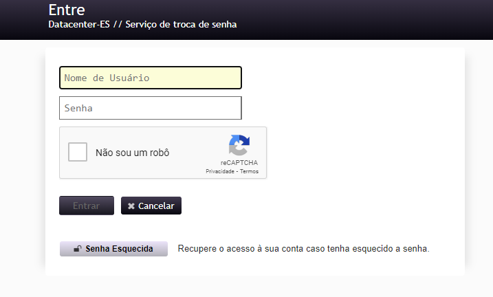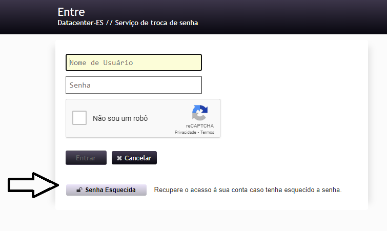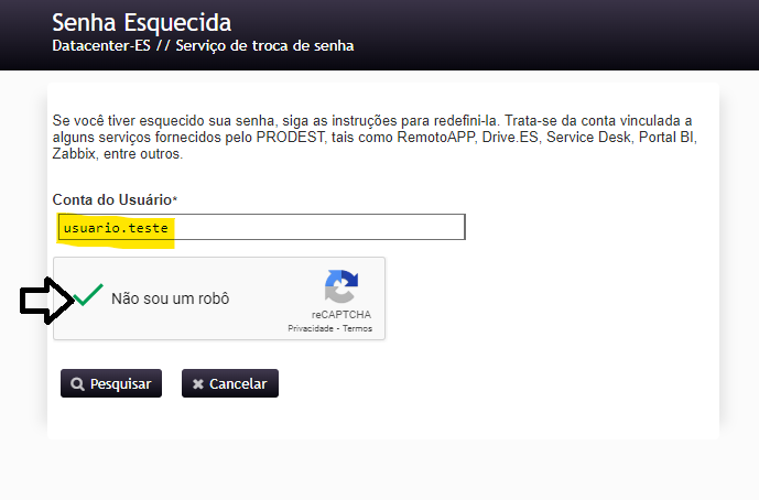 - Na próxima tela digite sua credencial de acesso (Usuário) e marque a opção "Não sou um robô":
