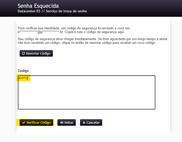 - Na tela seguinte digite o código recebido por e-mail e clique em verificar código: