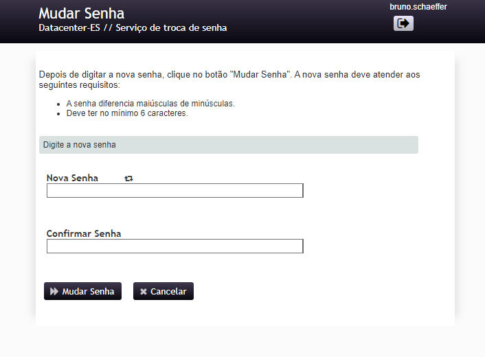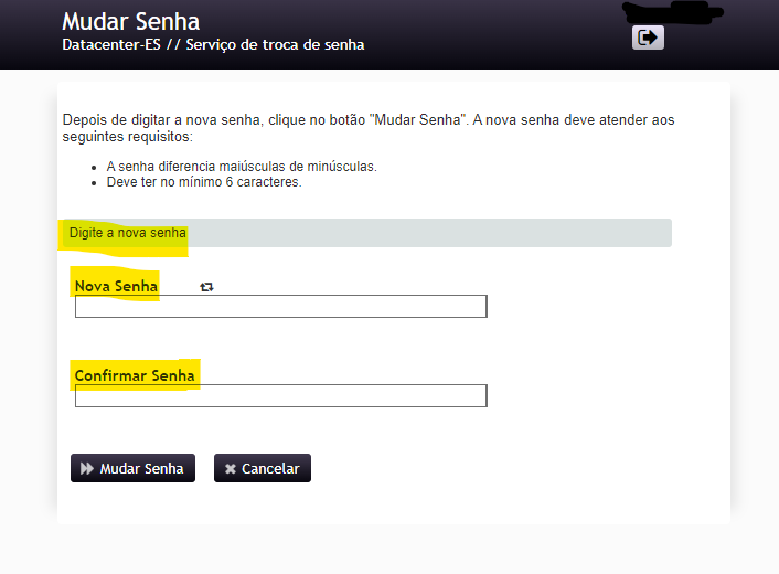 - Após a verificação do código você poderá digitar e confirmar uma nova senha e clicar em mudar senha, para finalizar o processo: